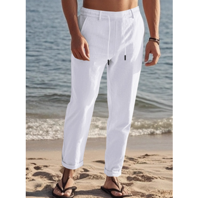 Men's casual pants drawstring simple and fashionable solid color casual cotton and linen straight leg pants for men